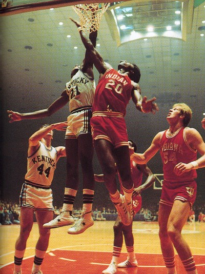 Jack Givens (#21) battles IU's Bobby Wilkerson (#20) while Bob Fowler (#44) and IU's Kent Benson (#54) look on
