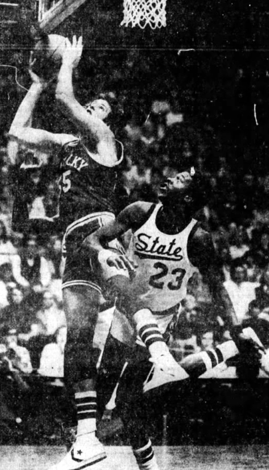 Mississippi State's Ray White (#10) grabs a rebound between Rick Robey (#53) and Merion Haskins (#30)