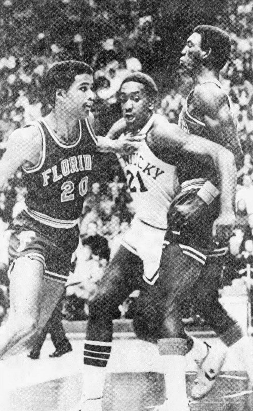 Florida's Robert Van Noy (#20) tries to use a pick to shake Jack Givens (#21)