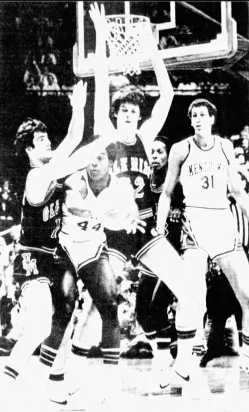 Charles Hurt (#44) looks to pass out of a double-team by Ole Miss players Sean Tuohy (#12) and Roger Steig (#52) while Sam Bowie (#31) and Elston Turner look on from underneath the basket