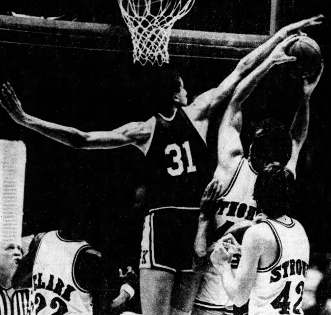 Sam Bowie (#31) blocks the shot of Tim Thomas