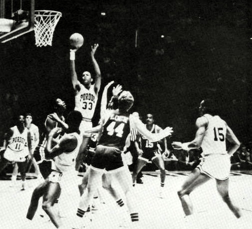 Purdue's Todd Mitchell (#33) shoots inside while guarded by Richard Madison and Winston Bennett. Also seen are Robert Lock (#44) and Ed Davender (#15)