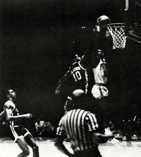 Jim Bullock dunks over James Blackmon (#10) while Kenny Walker trails the play