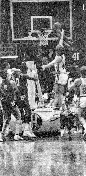 Eugene McDowell (#40) scores ahead of Rob Lock (#40)