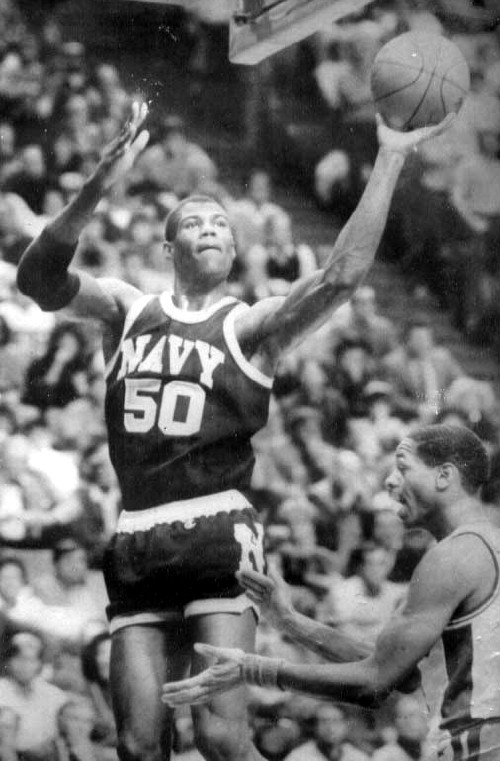 Irving Thomas (#30) fronts Navy center David Robinson (#50)