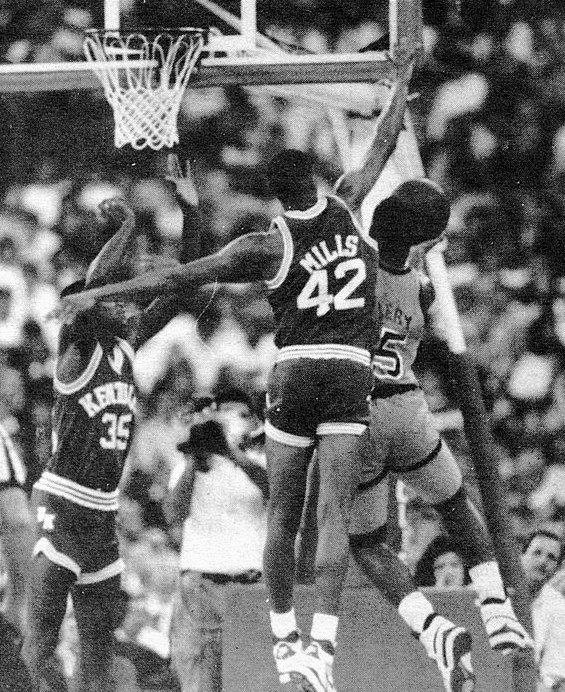 Chris Mills (#42) tries to block a Kevin Ellery shot