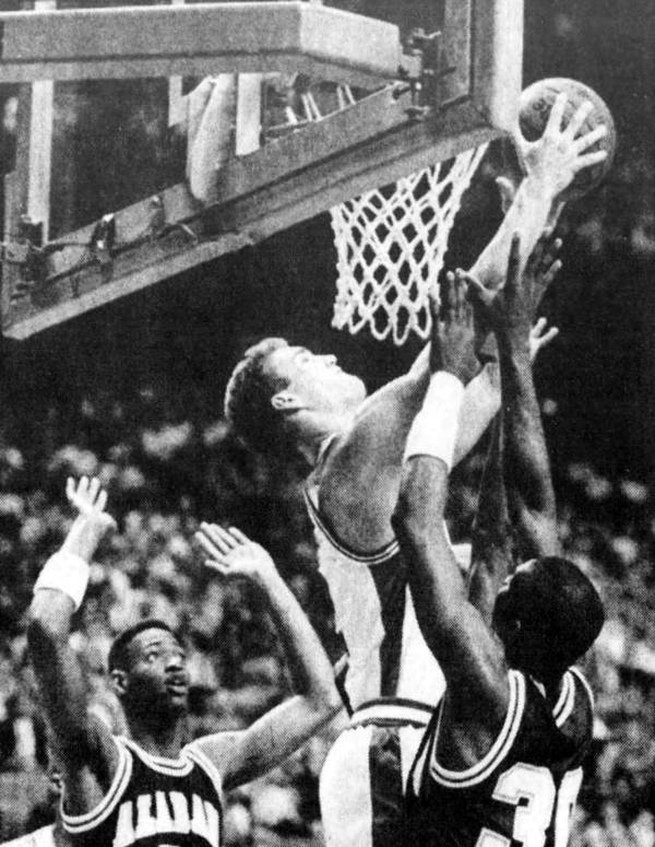 Deron Feldhaus attempts a reverse layup in between Alabama's Robert Horry and David Benoit