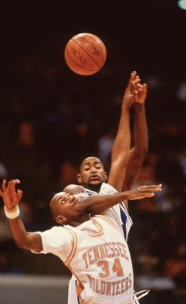 John Pelphrey (#34) looks to pass while guarded by UT's Carlus Groves and Allan Houston