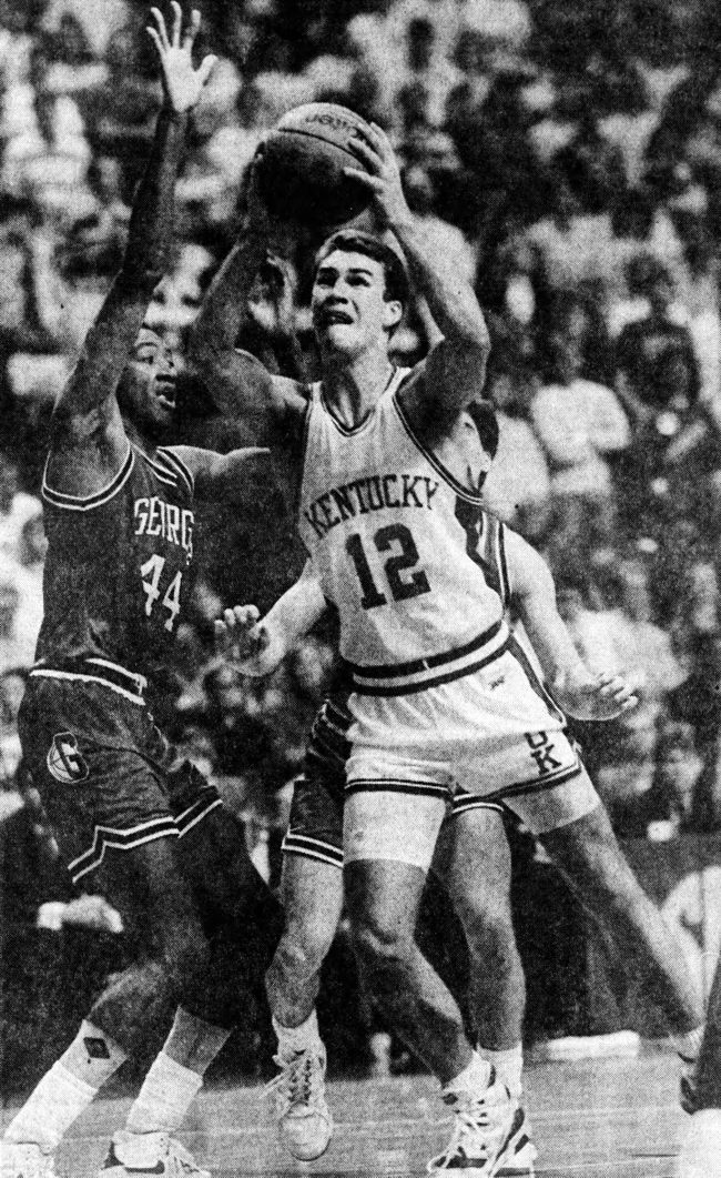 Deron Feldhaus (#12) scores ahead of Georgia's Rod Cole and Neville Austin