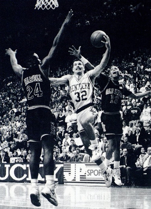 Richie Farmer (#32) drives in against Ole Miss defender Joe Harvell (#24) and Dondi Flemister (#13)