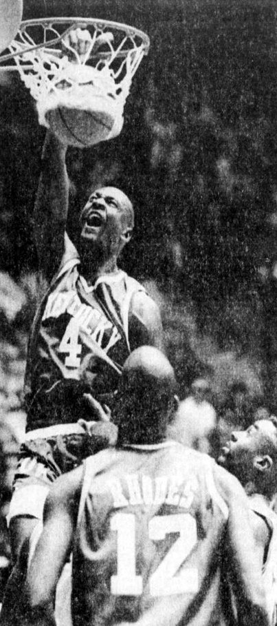 Special mention will have to be made of a rather unique event. Andre Riddick (are you sitting down?) hit *3* (that's T-H-R-E-E) free throws in a row!!! The first was on an old-fashioned three point play, and the other two were from a foul. Will wonder's never cease (the cheering from the Kentucky bench and UK fans can well be imagined)? In addition, Riddick had a goodly number of blocks in the game. Even Aminu Timberlake saw some action in the first half.