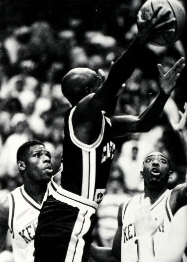 Delk turned it around to start the second half, hitting his first four free throws before burying his first 3 point attempt. Dent continued his scoring inside off of effective lob passes which only he could reach. Rodrick Rhodes blocked an EKU shot in which the ball traveled at least 50 feet into the stands. Then Travis Ford finally got it on track, hitting his first 3 pointer at the 14:32 mark, and getting another one about 20 seconds later. Effective inside play by Dent and 3 pointers by Jeff Brassow swelled the UK lead to 64-45.