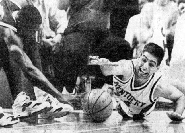 Poor Tony Delk really suffered early - he started 0-5. EKU hung tough and although they trailed by as much as 14 points in the first half, they cut the lead to 6 by halftime (39-33). Kentucky had 11 turnovers (to EKU's 9) in the first half, and had ended the half cold, missing 8 of their last 10 shots. UK's starting guards had not scored by halftime.