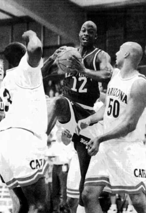Rodrick Rhodes (#12) secures the ball while surrounded by Arizona's Khalid Reeves and Joseph Blair (#50)