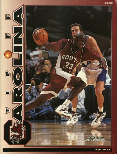 The Cats appeared listless and lethargic early on (perhaps thinking that merely by showing up they would win the game). USC was highly inspired on this, their Senior's Day (honoring Emmett Hall and Jamie Watson), and they played like it. USC went out to leads of 7-1, 9-3, and finally 17-7 with about 12 minutes left in the half. Kentucky went on a 14-3 spurt to take a 21-20 lead, and later went up 24-20 with 7.5 minutes remaining. The Wildcats appeared in control throughout the remainder of the first half, leading by 9 at intermission. USC had numerous passes over the defense, however, most of which resulted in wide-open layups or dunks. UK went for every fake, and nearly every time, its efforts to double-team the player with the ball allowed the Gamecocks to make passes to the open man for a score.