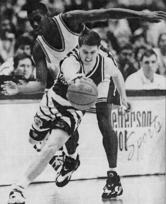 UK went up 4-3 following a Delk 19 footer (UK made an awful lot of long-but-not-3-point-shots in this game), and led most of the rest of the way. Florida managed to sneak back on top briefly at 12-11, from a Hill basket off a DeClerq steal, but UK managed leads of 2-5 points early on. With UK leading 19-16, Anderson was fouled by Martinez. He hit one free throw, but on the second, both DeClerq and Epps entered the lane early at exactly the same time, so a jump ball was declared and Florida had the possession arrow in its favor. A Riddick layup and Rhodes 3 sandwiched a Dyrkolbotn layup, to put the Cats up 24-20 with 8 minutes in the half. Minutes later, Delk hit a 3 which was launched at least 26 feet from the basket, to increase the margin to 27-22. Kentucky's tenacious zone defense kept the Gators from getting easy outside shots, and passing lanes inside were closely watched. Layups by Prickett and a slam by Riddick let the Cats go up 31-22.