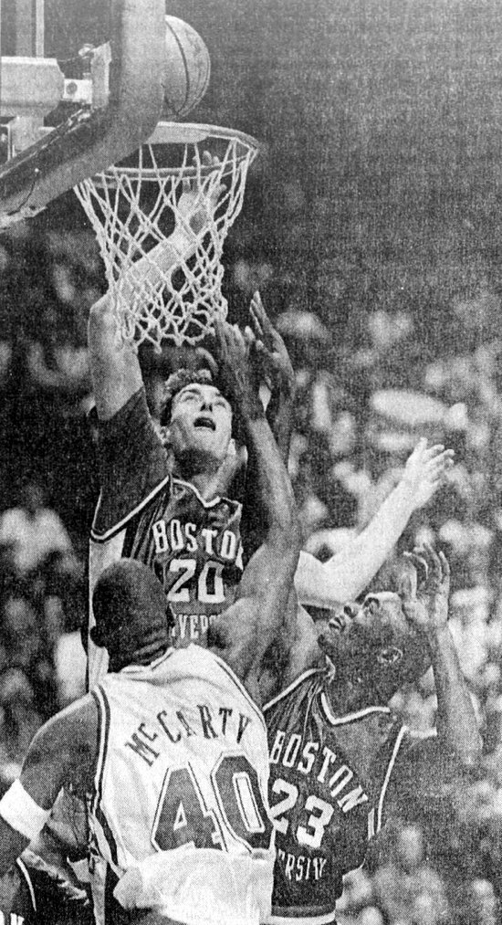 Boston's Dave Stiff (#20) and Tremain Byrd (#23) watch a shot by Walter McCarty (#40)