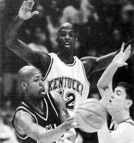 Antoine Walker (#24) and Mark Pope (#41) stuff a Marshall shot while Chris Harrison (#3) attempts to take a charge