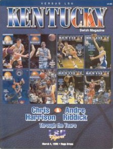 At this point, Chris Harrison was unleashed, and hit 3 consecutive 3 pointers to pull the Cats out to a 55-31 lead before Harrison missed a 3. Scott Padgett came in and hit a 3 on his 1st shot, and followed this up with a nice steal and assist to Epps for a 3. A fine Epps-to-Prickett pass ended the half with a UK dunk and Kentucky up 63-36. By halftime, the Wildcats had hit on 12 of 18 3 pointers, with Delk scoring 21 points and Epps 10.