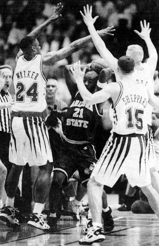 Antoine Walker (#24), Jeff Sheppard (#15) and Mark Pope surround Arizona State's Jeremy Veal