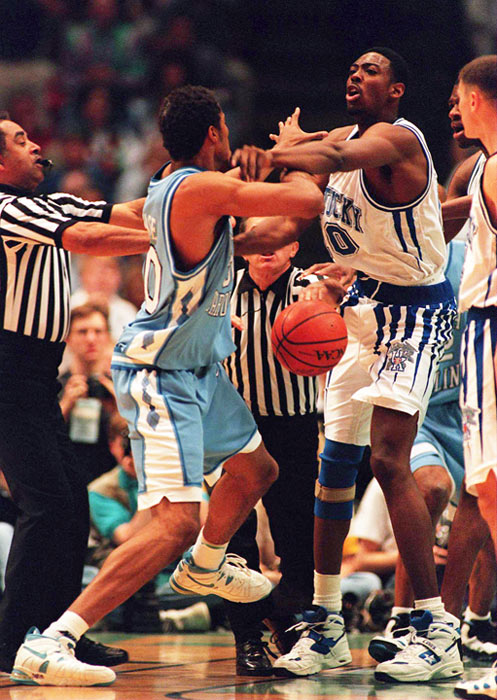 UNC's Jerry Stackhouse blocks the shot of Tony Delk (#00)
