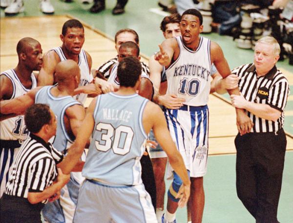 When the score was 8-2 in UK's favor, Andre Riddick fouled Rasheed Wallace from behind during a UNC entry pass under the basket. Wallace bobbled the ball slightly (he was being double teamed by UK), and after solidifying his hold on the ball, he sharply swung his left elbow, which connected with Andre Riddick's jaw. Andre took exception to this, and put his hands around Wallace's throat before the 2 were separated. Officials conferred for a long time in making their final decision, and consulted the CBS monitors of play before issuing an incredible ruling. Riddick was assessed the personal foul for bumping Wallace, and Wallace was issued an unsportsmanlike foul for the elbow. But instead of placing the second unsportsmanlike foul on Riddick (who attacked Wallace), the officials erroneously gave the foul to McCarty, whose only participation in the play was to attempt to separate combatants. It appeared incredible that the officials could not distinguish between #10 and #40 for Kentucky, but they couldn't, and it was even more amazing that CBS later interviewed Dr. Hank Nichols, coordinator of all officials for the NCAA, who backed up the call against McCarty and assured CBS that the correct man had been identified.