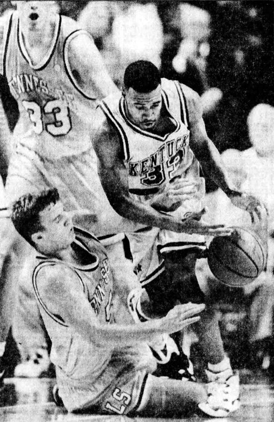 Mark Pope (#41) tries to defend a UT entry pass to Steve Hamer (#21)