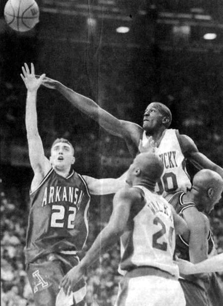 Arkansas' Pat Bradley (#22) shoots while defended by Tony Delk (#00)