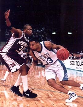 Ron Mercer (#33) drives on MSU's Dontae Jones