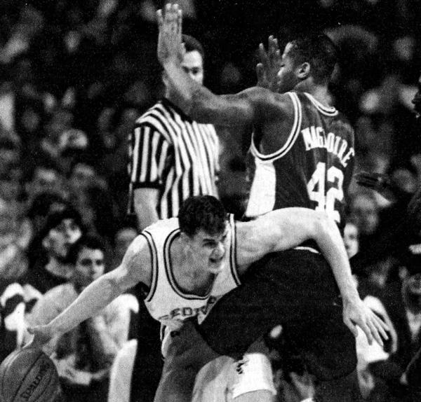 Ron Mercer (#33) dunks ahead of Georgia Tech's Matt Harpring (#15)