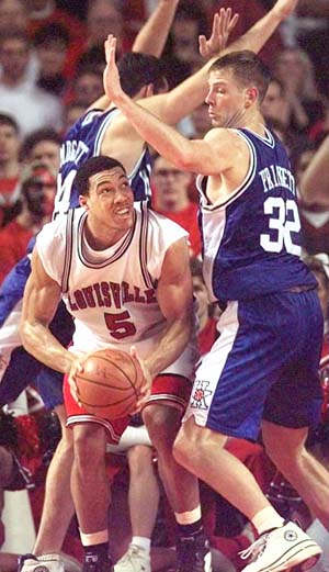 Derek Anderson flies in for a slam over Louisville's Nate Johnson (#21) while Alex Sanders (#44) looks on