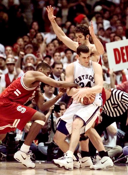 Kentucky made it to its 3rd consecutive national championship game as the Cats held on to defeat a very talented and determined Stanford Cardinal team 86-85 in overtime in San Antonio, Texas during the NCAA Final Four. Kentucky was the winner of the South Regional, and a #2 seed, while Stanford won the Midwest Regional, and was a #3 seed. In the last AP poll, Kentucky had been #5, with Stanford #10.