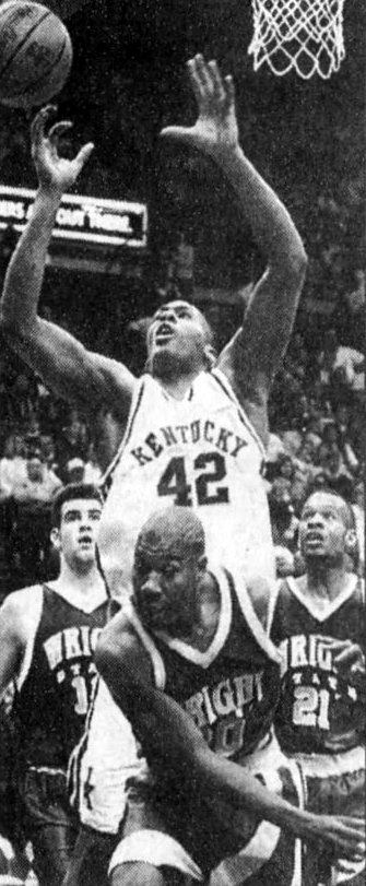 During this surge, Wright State Coach Ed Shilling got a technical foul for complaining to the refs and being out of the coaching box (Padgett made the FT) and very nearly got a 2nd technical. Turner and Curry exchanged FGs, as did Evans and Brooks, and by the next TV timeout it was 65-46 Wildcats. Minutes later, following a Curry 3, Brooks made a layup and was fouled by Allison. He made the FT, to make the score 72-56 [JNB note - UK Radio Network announcer Ralph Hacker, however, said the FT was waved off from a lane violation, and he didn't correct himself for the remainder of the game, causing me considerable confusion when recording the score for the rest of the contest.] Smith broke away from the pack and had a rare dunk for a 74-56 edge. Curry and Allison exchanged buckets, then Allison got a layup and Camara got a hook, and it was 78-58 UK. The margin flickered between 18 and 20 pts until Turner got a FG and a quick layup off a steal for an 86-62 margin. By the last TV timeout it was 91-66 Kentucky, their largest lead of the night. Tackett was finally inserted into the game, and following a May FG and a Brooks 3, Myron Anthony was the last Wildcat off the bench to come into the game. Camara and Brooks exchanged baskets, Holmes got a layup and Camara hit a bank shot, to make it 95-7. Finally Anthony got a fingerroll basket and the final score was 97-75 Kentucky.