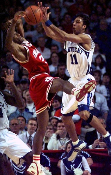 UK got the opening tap, and Turner drove for a tough 8 footer to make it 2-0 Kentucky. Washington answered right back with a 16 footer. Prince had his foot on the 3 pt line for a long 2, then Evans hit a 19 footer. With UK playing tenacious defense, Indiana had a hard time getting a decent shot away, and after several misses, Kentucky got the ball and Bradley made an old-fashioned 3 for a 9-2 lead. Padgett made a stellar clean block, but was called for the foul (by Ed Hightower), and Gladness made 1 FT. Guyton added a layup seconds later to make it 9-5 UK. Evans made a FT for a 10-5 lead, and the score stood there for quite a while as both sides played outstanding defense. Padgett got another clean block against Lewis (surprisingly, this time there was no foul called), and yet another against Haston. Finally Guyton made a FT to end the scoring drought. UK was inefficient on its next possession, missing several opportunities, and Haston finally got the ball and made a layup. But Padgett connected on a 3 to make it 13-8, then he made a tough reverse basket underneath, and Turner got the ball on a breakaway and had a dunk for a 17-8 margin, forcing Bobby Knight to call a timeout. Washington and Recker scored to narrow the lead, and Indiana's Rob Turner made a 15 footer as the shot clock expired to close to within 17-14. But Bradley got off a beautiful assist to Camara for a dunk, and Evans was fouled and connected twice from the FT line, for a 21-14 UK edge. Haston finally hit a hook shot in the final minute to end all scoring for the half, which saw the Wildcats leading the Hoosiers 21-16. A tremendous collision between several players took place in the final seconds of the game, off an IU miss and rebound try, but no fouls were called. The Cats shot a pathetic 26% from the floor in the 1st half, with Indiana connecting on only 28%. The Hoosiers missed all 6 3 pt tries, with the Cats making only 1 of 7. Indiana scored only 1 FG in the game's final 5:22, and UK made only 1 basket in the final 7:45 of the contest. The score represented a halftime low for both schools (Indiana's previous low was 26 pts against Indiana State, and Kentucky had previously scored only 25 in their loss to Pitt in Puerto Rico).