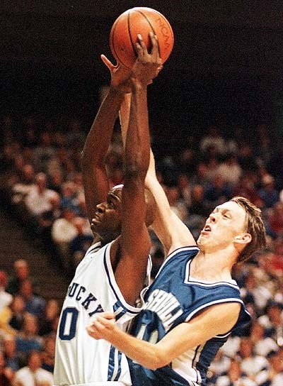 Jamaal Magloire (#42) blocks the shot of UNC Asheville's Brett Carey (#11)