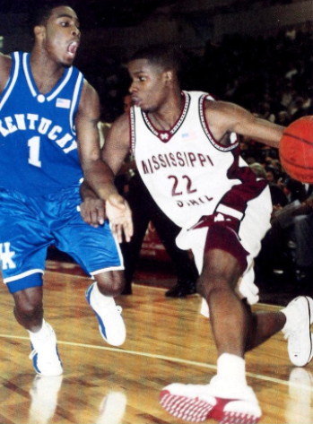 MSU's Derrick Zimmerman (#22) drives against Kentucky's Cliff Hawkins (#1)