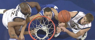 Notre Dame's Matt Carroll (#13) guards Keith Bogans while Gerald Fitch (#4) looks to get open