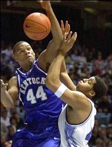 Chuck Hayes (#44) outbattles UNC's Sean May for a rebound