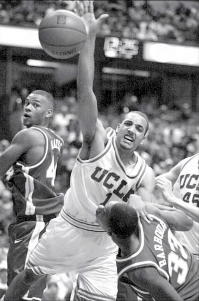 UCLA's Dijon Thompson (#1) reaches for the ball over Antwain Barbour while Chuck Hayes looks back
