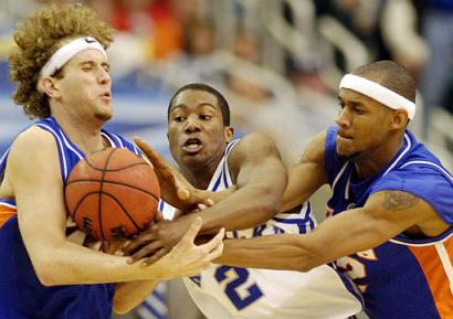 Ravi Moss (#2) battles Florida's Matt Walsh and Bonell Colas for the ball