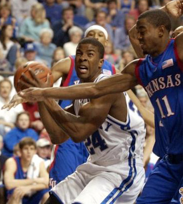 Meanwhile, UK's post players were suffering their worst performance of the season with the exception of the North Carolina loss. Freshman Randolph Morris, who had shown signs of growth the past few games, missed all eight of his field goal attempts and was repeatedly beaten on the glass by Kansas freshmen CJ. Giles and Sasha Kaun.