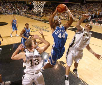 UK seems to be more comfortable as well, but it took a clutch play by Hayes that sparked a 14-2 second half run to put the game away. Ahead just 57-45, Hayes produced a steal that led to a Patrick Sparks lay-in, then raced back downcourt and swatted away a Smith lay-up attempt that led to two Perry free throws and a 61-45 lead. The edge ballooned to a game-high 71-47 with 9:51 left on a Ravi Moss putback before UK lost focus in the closing minutes and allowed Vandy to cut the final score to a respectable margin.