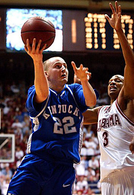 UK certainly needed an emotional spark at the break. Alabama was dominating play behind Chuck Davis in the paint and Kennedy Winston's four three-pointers, pushing out to a 33-19 lead late in the half. But the Cats set the stage for their comeback by finishing the first 20 minutes on a 10-3 run to cut the lead to just 36-29. In the final minute, Moss battled for an offensive rebound and cored on a putback and then Rajon Rondo stripped Ronald Steele at halfcourt and converted a dunk to pull UK within striking distance.