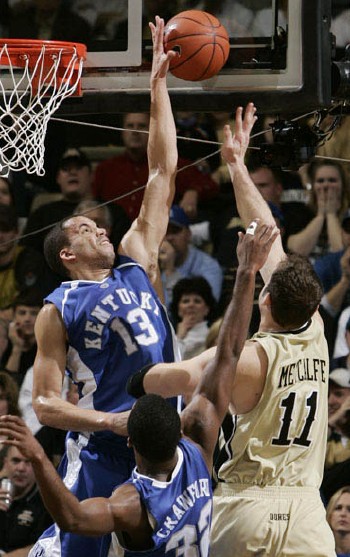 Bobby Perry (#13) blocks a shot by Vandy's Alan Metcalfe (#11)