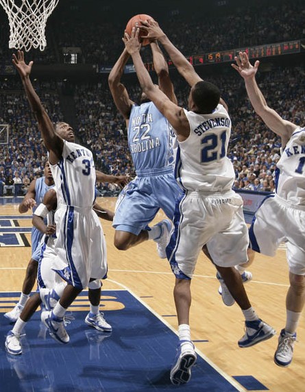 Perry Stevenson (#21) blocks the path of UNC's Wayne Ellington (#22) as Ramel Bradley (#3) helps