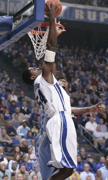 Patrick Patterson (#54) reverse dunks behind UNC's defense