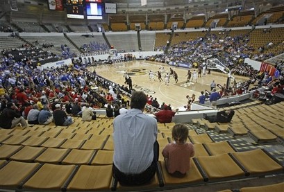 Two lucky fans watch the proceedings in a largely empty arena (due to the game being moved and the SEC barring non-privileged fans from attending)