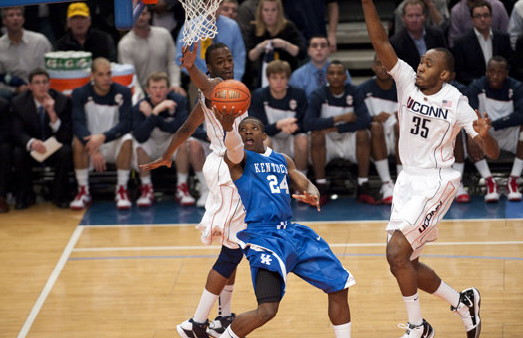 Whatever Calhoun said in the second timeout must have struck a nerve because UConn was a different team for the rest of the half. Dyson, the Huskies' leading scorer, scored six straight points during a 10-0 run that cut the lead to two. As the Cats kept missing shots (3-of-25 to end the half), getting beat in transition defense and piled up foul trouble UConn rushed past and built a 26-18 lead on the strength of a 26-6 run reminiscent of the spurt UK put on North Carolina in its previous game. The Cats managed to stay within 29-23 at the half despite being hammered on the glass and playing the final the eight minutes without Wall, DeMarcus Cousins and Daniel Orton.