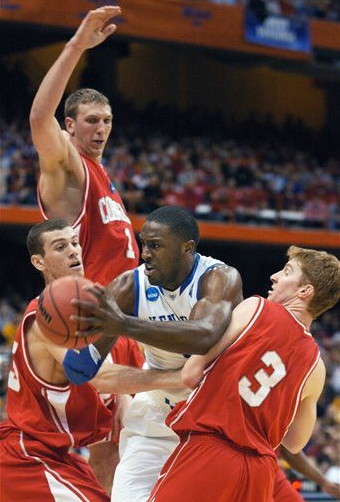 Patrick Patterson is surrounded by Cornell's Chris Wroblewski (#3), Jon Jaques and Jeff Foote