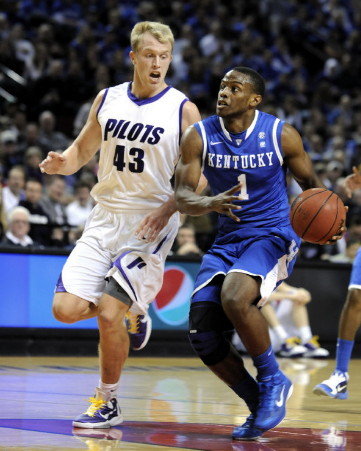 Darius Miller (#1) drives and is challenged by (#43) Luke Sikma (son of Seattle Sonic great Jack Sikma)